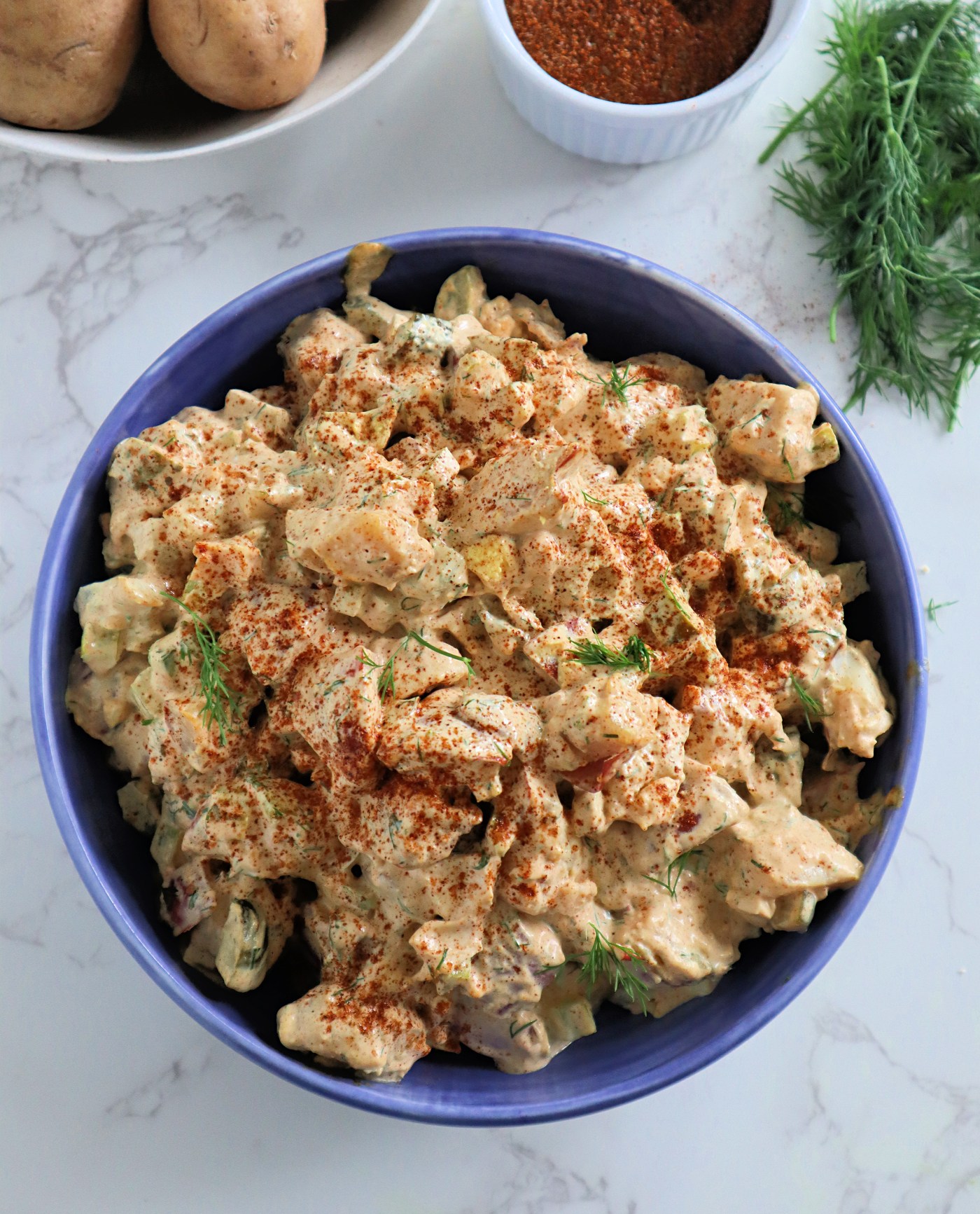 The salad should be refrigerated for at least two hours before serving to allow the flavors to mingle and the potatoes to absorb the dressing. For an extra punch of flavor and/or texture, you could sprinkle a little chopped cooked bacon on top, add a handful of diced ham or stir in some shredded Colby-Jack or sharp cheddar cheese.