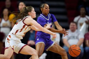 FILE – Florida Rep. Anna Eskamani talks with a colleague at the end of a meeting of the House Economic Infrastructure Subcommittee during a legislative session at the state Capitol in Tallahassee, Fla., March 5, 2025. (AP Photo/Rebecca Blackwell, File)