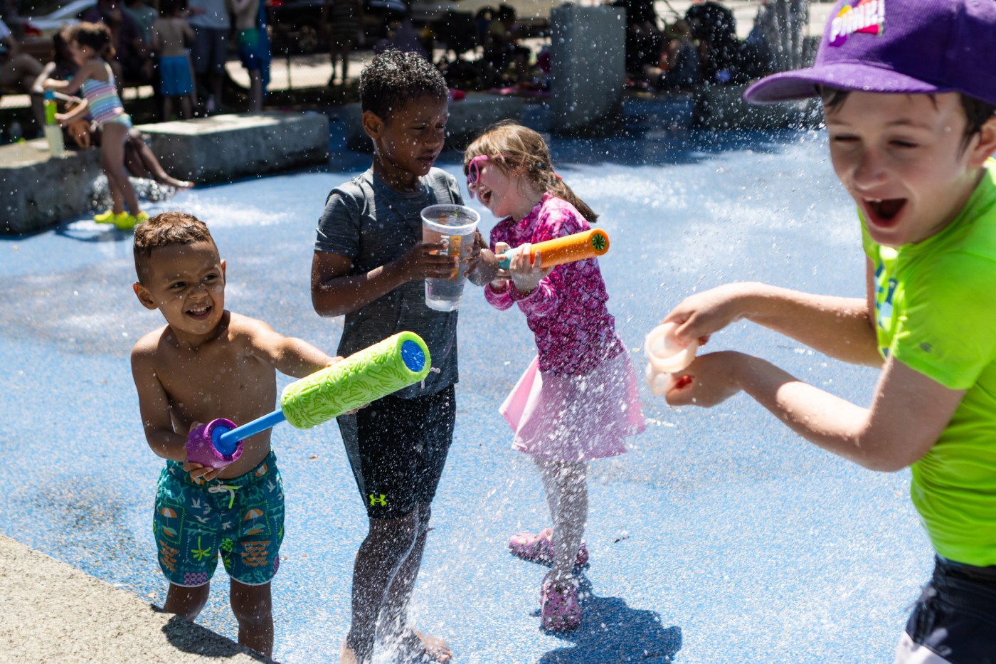 Children fill up buckets and bottles at the Johnson Park splash pad during a day of water play. (Libby O’Neill/Boston Herald)