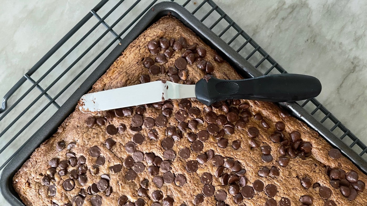 4. Transfer batter to prepared pan. Using a silicone spatula smooth out batter pushing batter into the corners and making it even. Tap lightly on the counter to remove any air pockets. Scatter chocolate chips on top of batter, gently pressing them down a little.