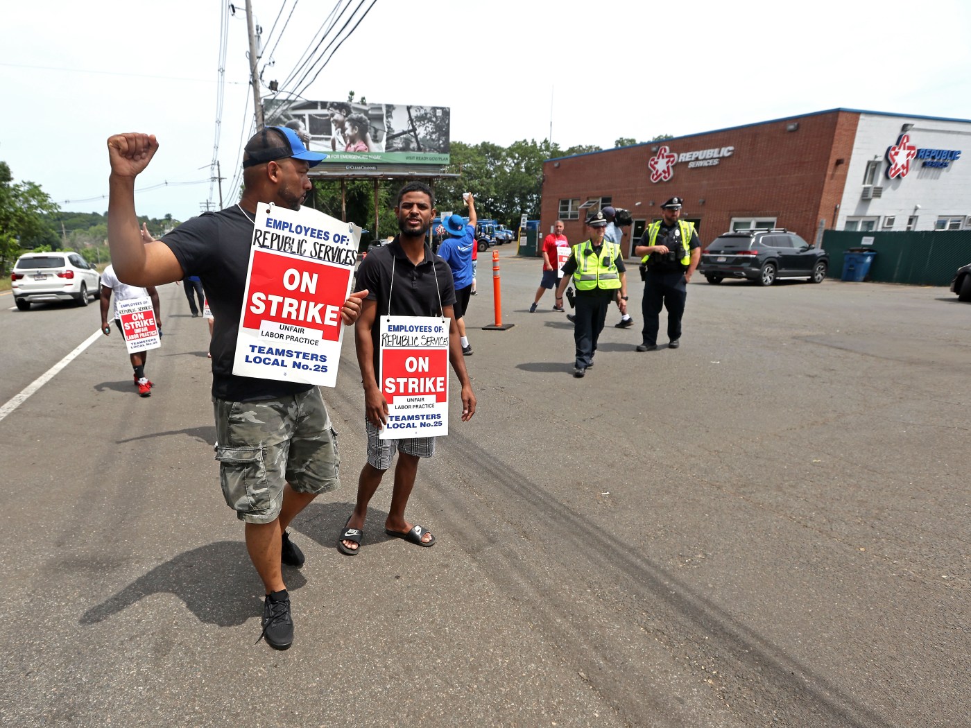 A contingent of the 450 members of Teamsters Local 25 continued their strike as negotiations continue with Republic Services, a waste management company with operations across the nation including Massachusetts, with a demonstration Saturday afternoon on Newbury Street in Peabody.