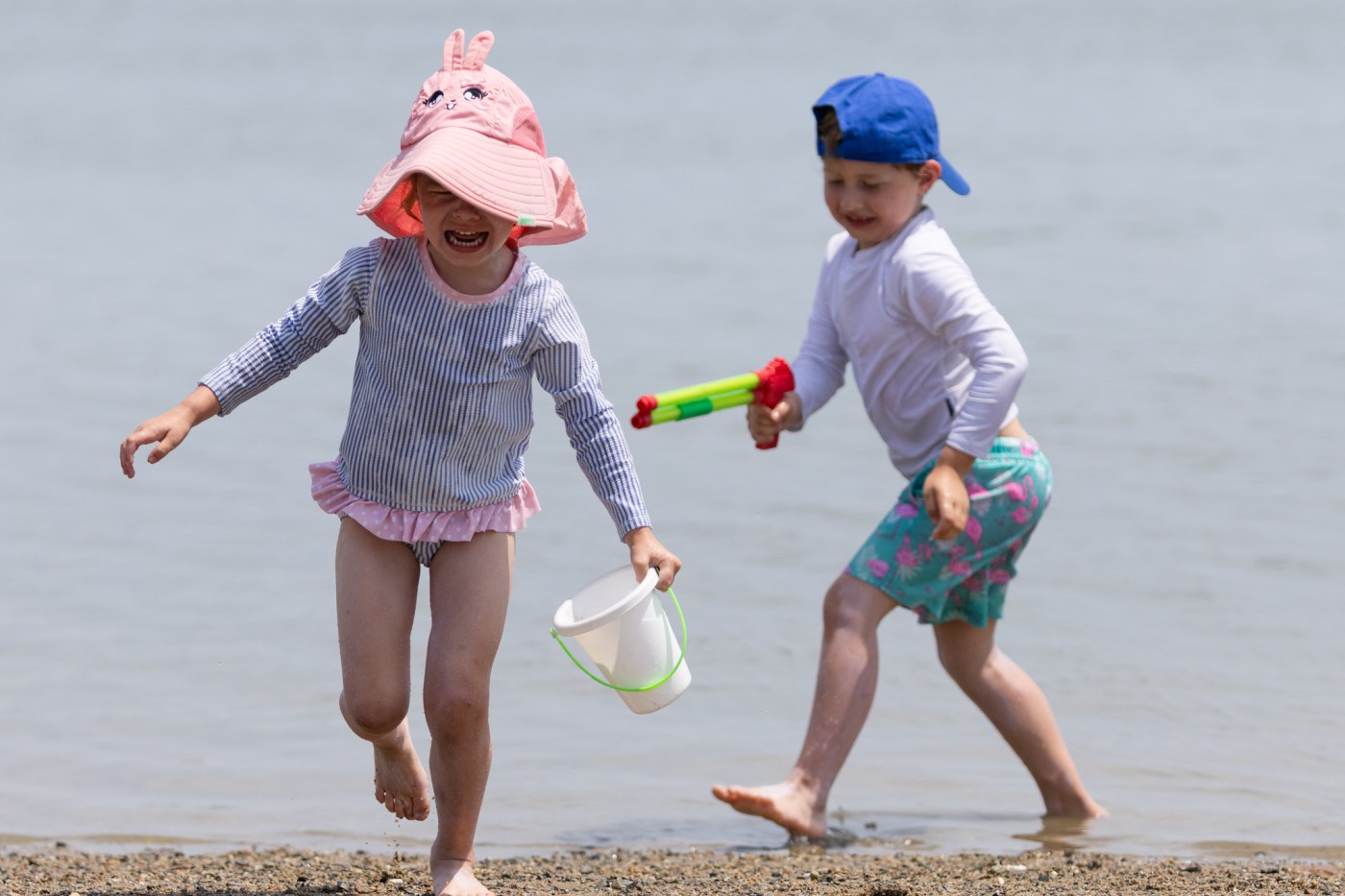 David Burke, 9, of Braintree, watches as his sister Hannah, 11, gets splashed during a playful water fight at Pleasure Bay. (Libby O’Neill/Boston Herald)