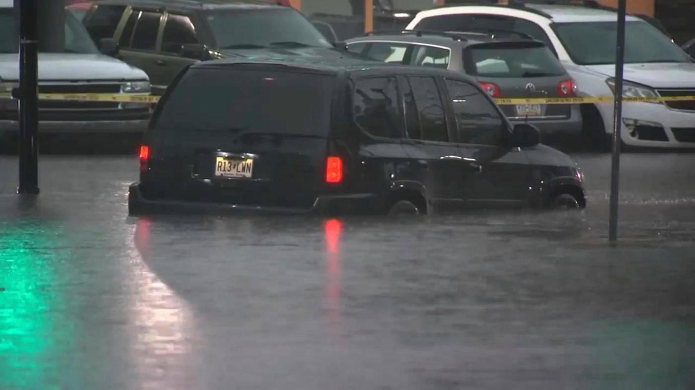 This image made from video shows a flooded street in Rahway, N.J., on July 14, 2025.(WABC-TV via AP)