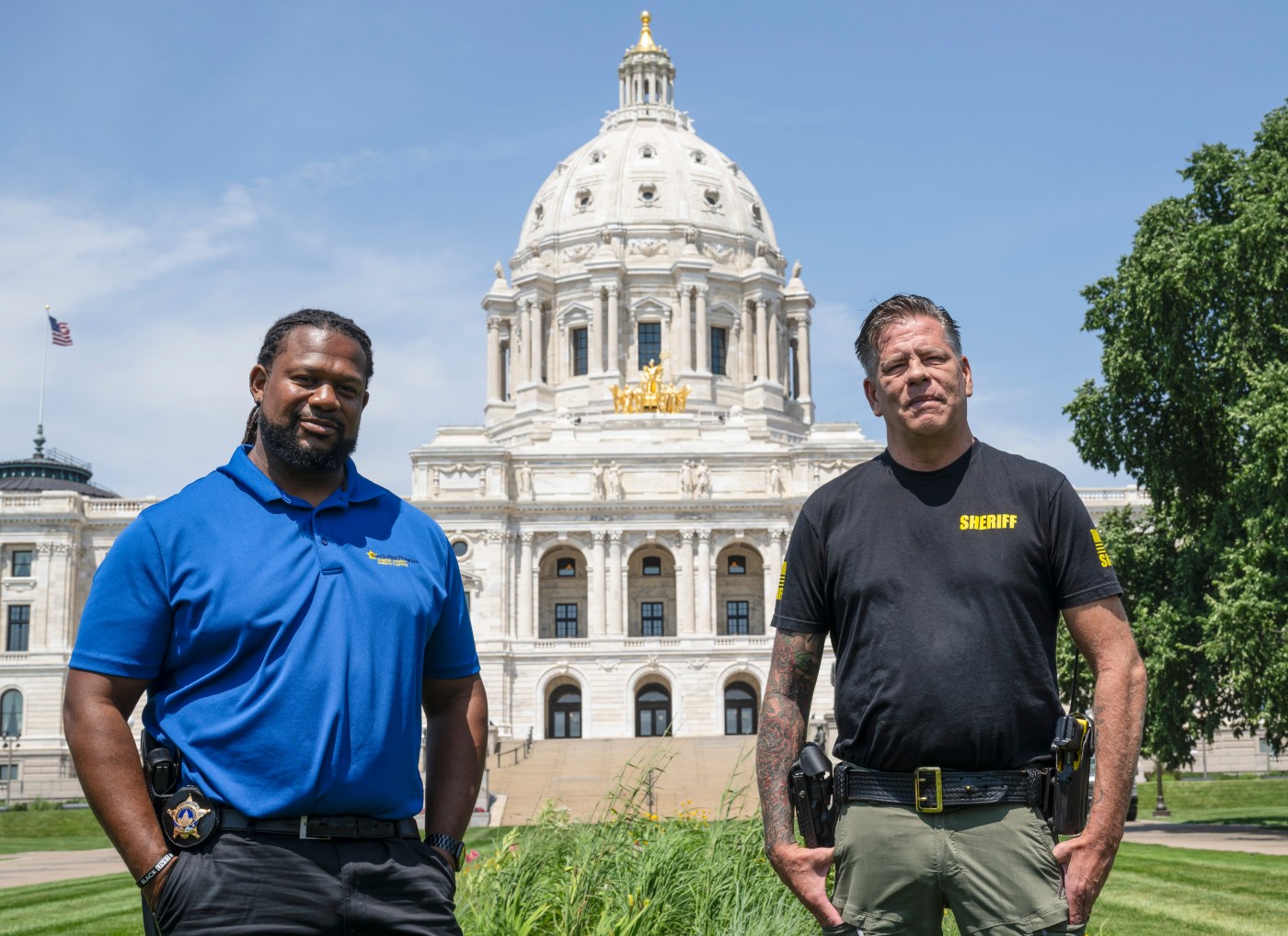 Ramsey County Sheriff’s deputies Marco Barton, left, and John Gleason at Cass Gilbert Memorial Park, which overlooks the State Capitol building in St. Paul, on Monday, July 14, 2025. (Frederick Melo / Pioneer Press)
