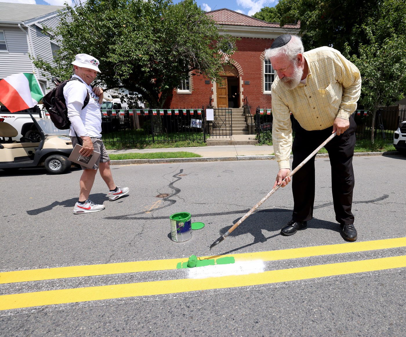 After a controversial move by the city of Newton to paint over street lines that were the color of the Italian flag back to yellow, some residents are taking it upon themselves to repaint small sections on Adams Street back to the Italian colors. (Mark Stockwell/Boston Herald)