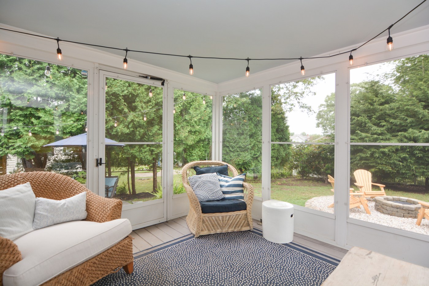Inside, light and air dominate. The kitchen features quartzite countertops and stainless steel appliances, with soft blonde hardwood floors running throughout. A shiplap-clad fireplace anchors the living room, while the entry foyer carries the same detail, creating a cohesive and welcoming flow. Off the back, a three-season sunroom — painted in calming hues, strung with lights, and furnished with repurposed rattan, offers the perfect perch to watch the fire pit glow as night falls.