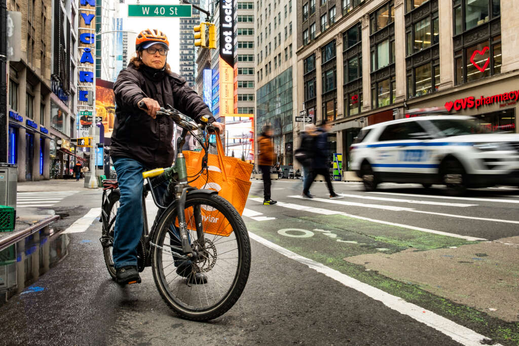 Repartidor de comida para aplicaciones en las calles de Manhattan en 2020. (Photo by Adi Talwar)