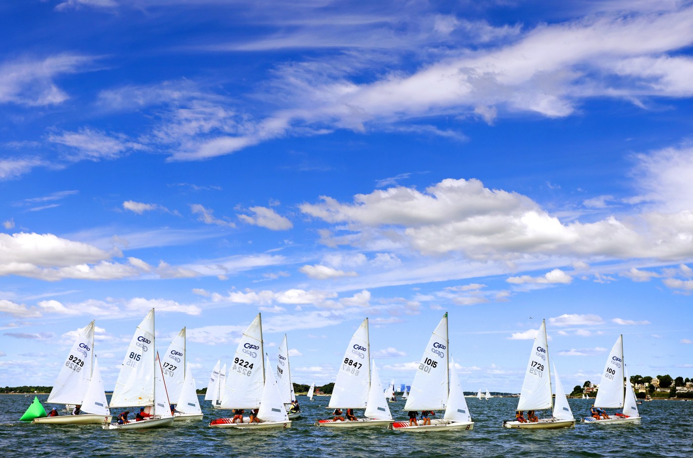 Hull, MA – July 18 – With the Boston skyline in the distance young sailors sail their 420’s during the Hull Yacht Club Junior Scorpion Bowl Regatta. (Photo By Matt Stone/Boston Herald)