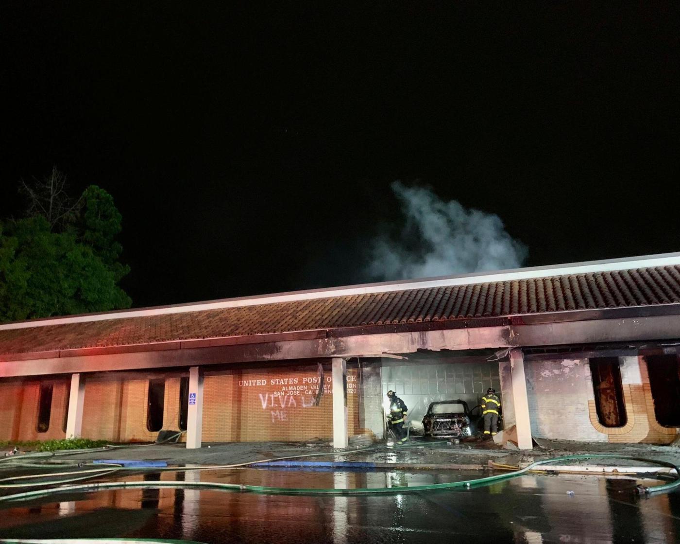 About 50 firefighters took about an hour and a half to knock down the flames at the Almaden Valley Station Post Office south of downtown. Photos posted online by the fire department showed a charred vehicle inside the heavily damaged one-story building.