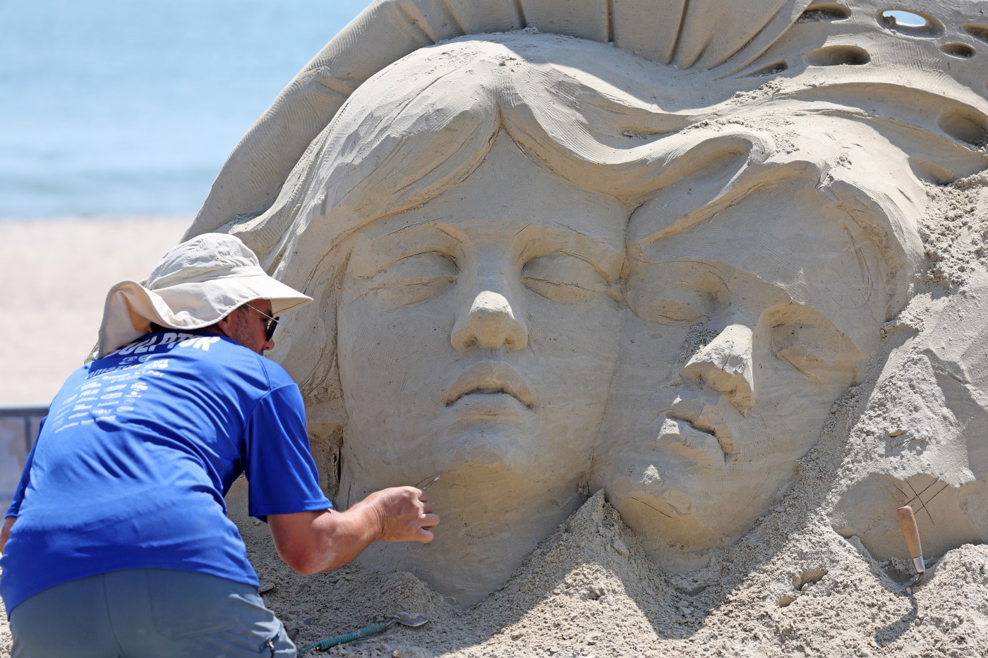 Canadian sand sculptor Jobi Bouchard meticulously carves details into his creation during the Revere Beach International Sand Sculpting Festival. (Matt Stone/Boston Herald)