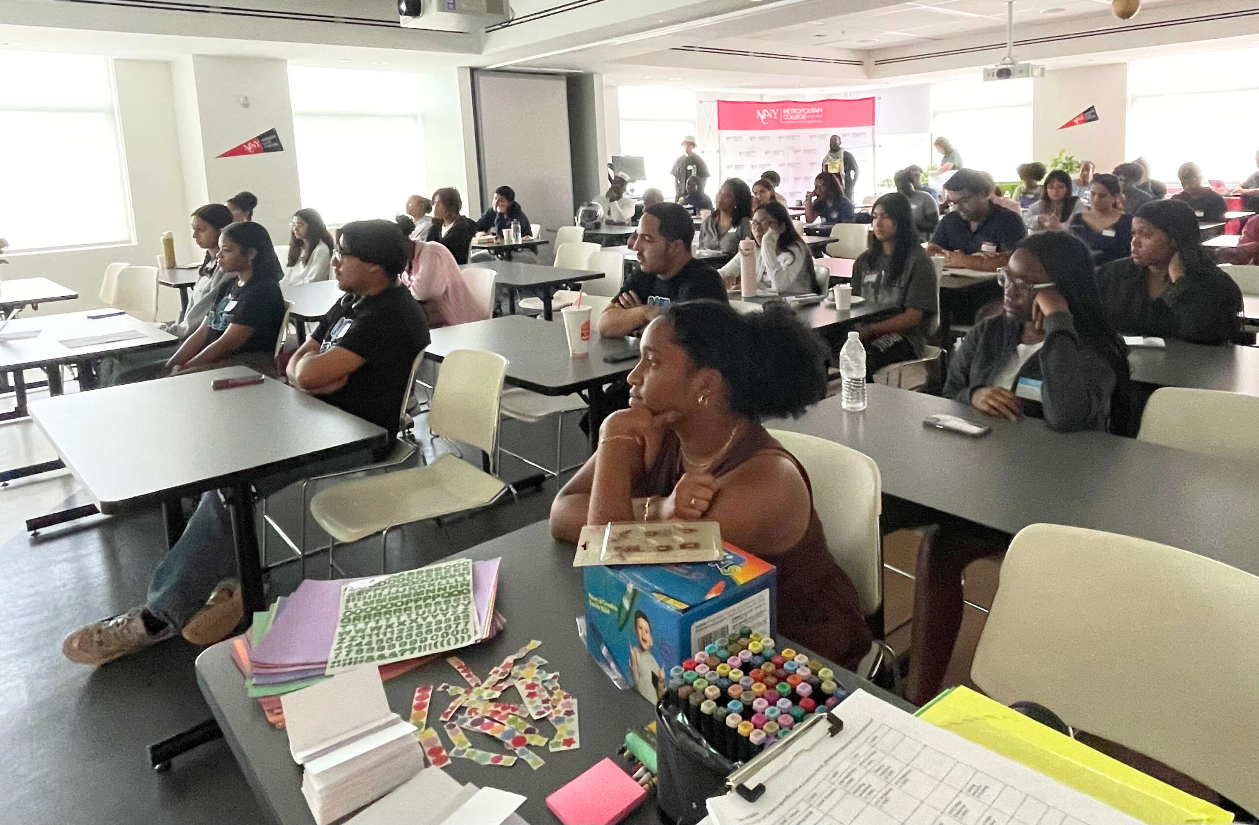 Young attendees listen as the Nos Quedamos symposium kicks off on the Bronx campus of the Metropolitan College in late July. (Photo by Dylan Hernandez for City Limits)