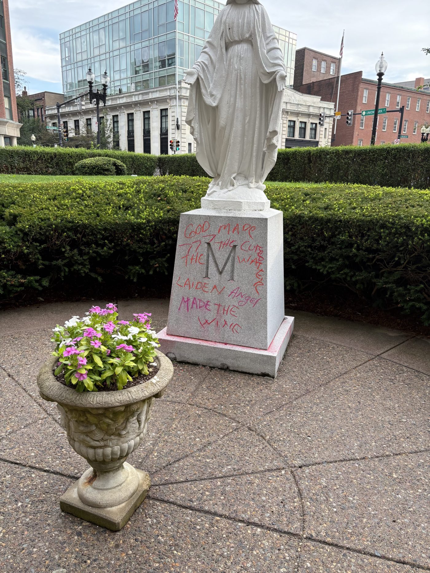 “The Blessed Mary statue at the Cathedral of the Holy Cross was vandalized last night with graffiti,” Flynn wrote on X. “The incident is similar to other attacks on statues in New York and Florida. I contacted Boston Police and recommended the vandalism be investigated as a hate crime.”