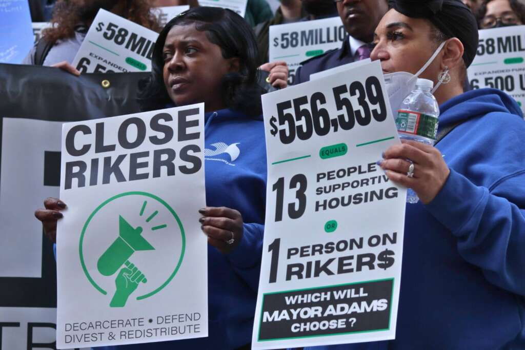 A May 2023 rally calling for the city to move forward with plans to close Rikers, citing the costs of incarceration compared to supportive housing. (Neha Gautam/Urban Justice Center)