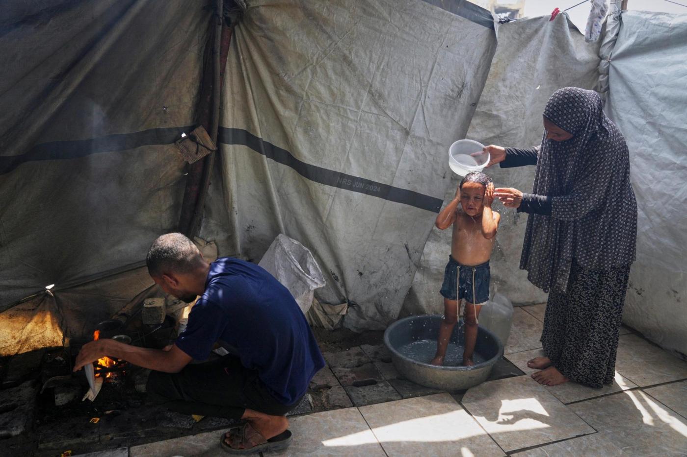 Such scenes have become the grim routine in Muwasi, a sprawling displacement camp in central Gaza where hundreds of thousands endure scorching summer heat. Sweat-soaked and dust-covered, parents and children chase down water trucks that come every two or three days, filling bottles, canisters and buckets and then hauling them home, sometimes on donkey-drawn carts.