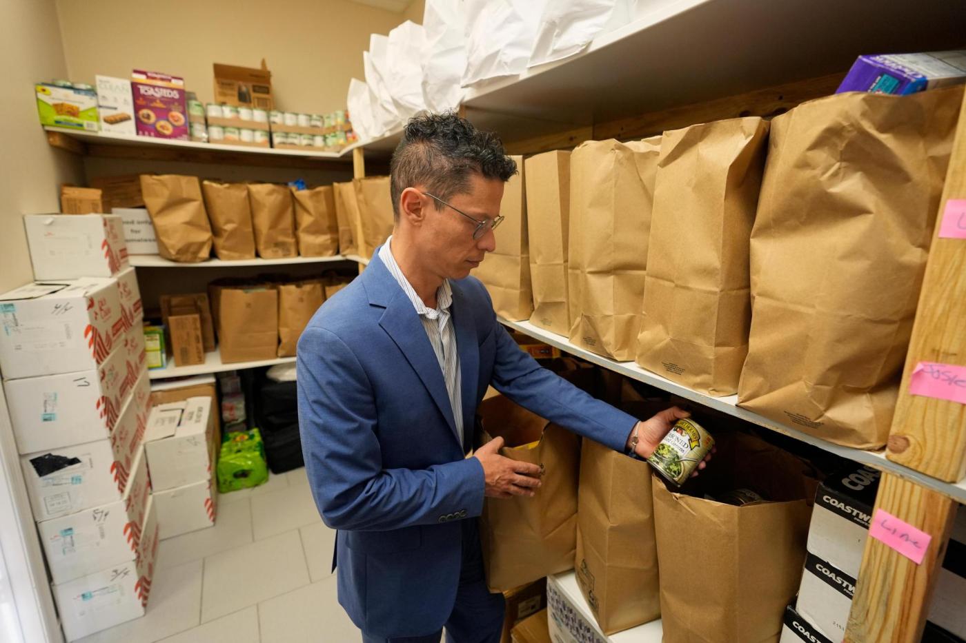 Felipe Sousa Lazaballet, executive director of the Hope Community Center walks through an area that can be set up for feeding families if they were to encounter a disaster Thursday, Aug. 14, 2025, in Apopka, Fla. (AP Photo/John Raoux)