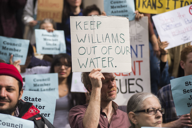 A rally against a proposed Williams pipeline on the steps of City Hall in March 2019. Two of the company’s previously rejected projects are getting new consideration under the Trump administration, to the dismay of environmentalists. (Jeff Reed/NYC Council)