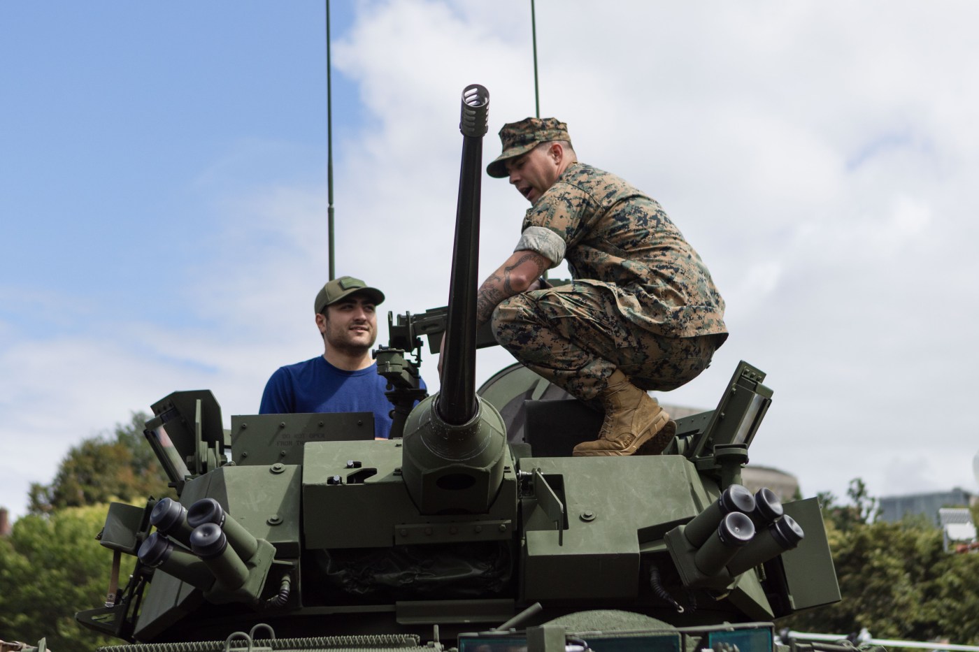 Marines showcase military vehicles and equipment, inviting attendees to climb in and explore as part of the static display unveiled during the Marine Week Boston opening ceremony. (Libby O’Neill/Boston Herald)