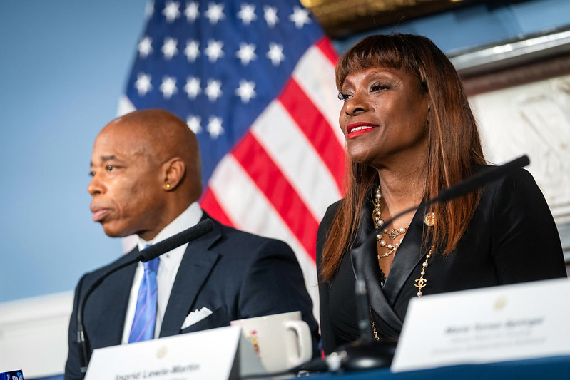 Mayor Eric Adams and former adviser Ingrid Lewis-Martin at a City Hall press conference in 2023 ( Ed Reed/Mayoral Photography Office.)