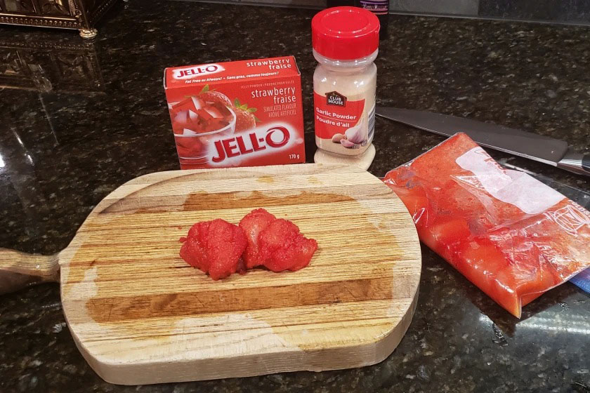 Why strawberry Jello-O powder and not some other flavor, I’m not sure, but when in doubt, follow the recipe.