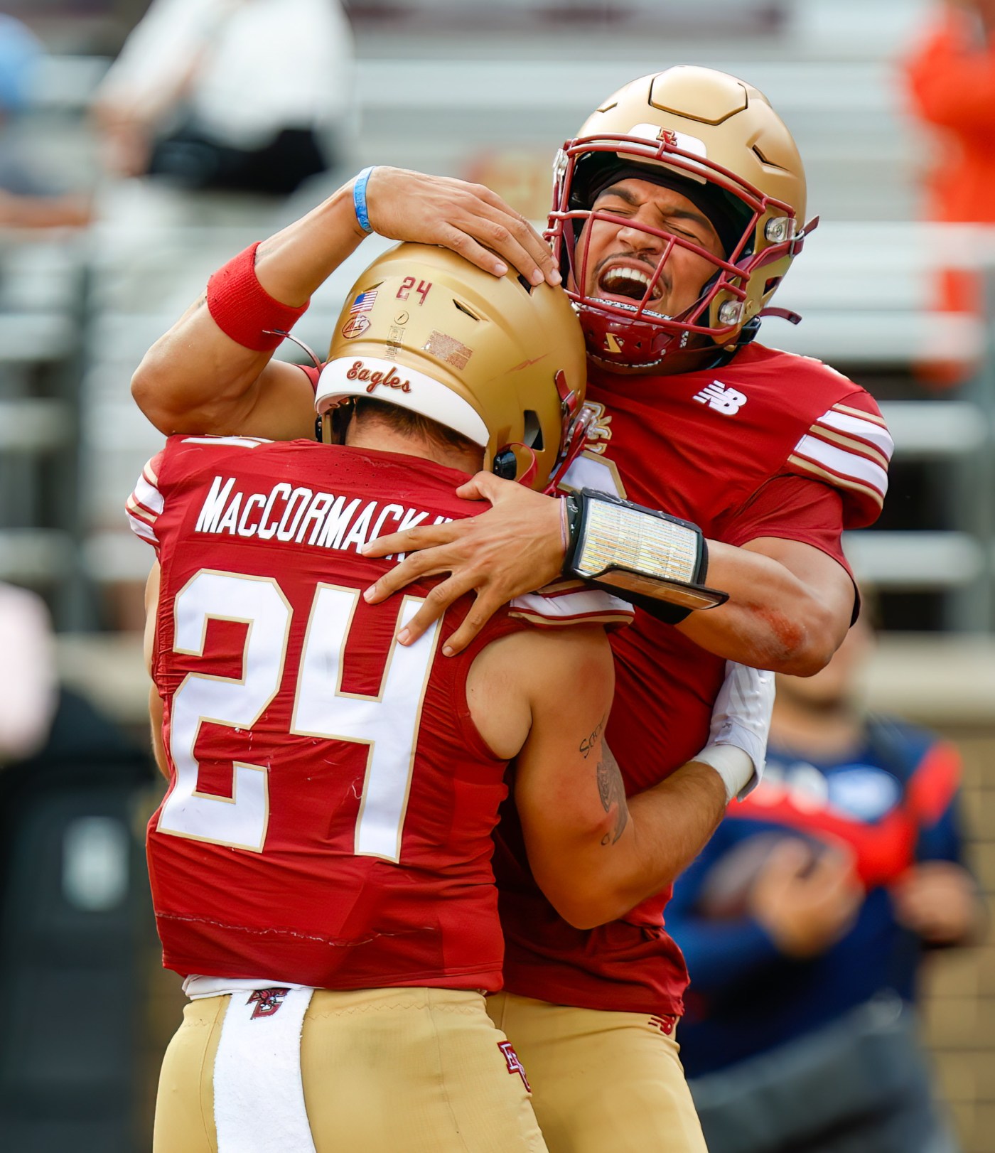 Boston College wide receiver Jaedn Skeete celebrates after scoring on a 13-yard touchdown pass during the first half. (James Thomas photo)