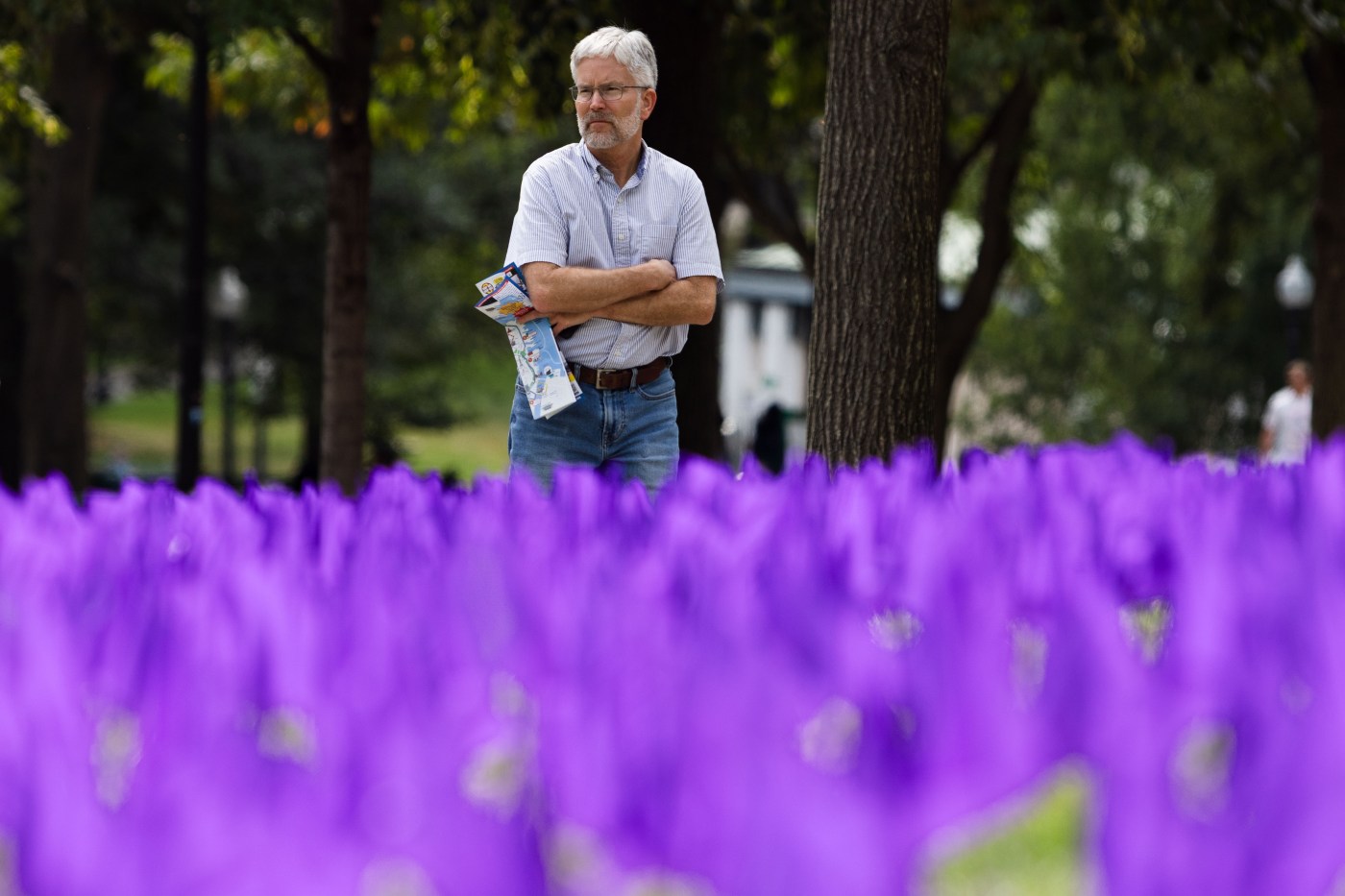 Volunteers were supported by the Boston Public Health Commission and the city Parks and Recreation Department in planting more than 20,000 purple flags in the park to memorialize those who have died in the opioid epidemic.