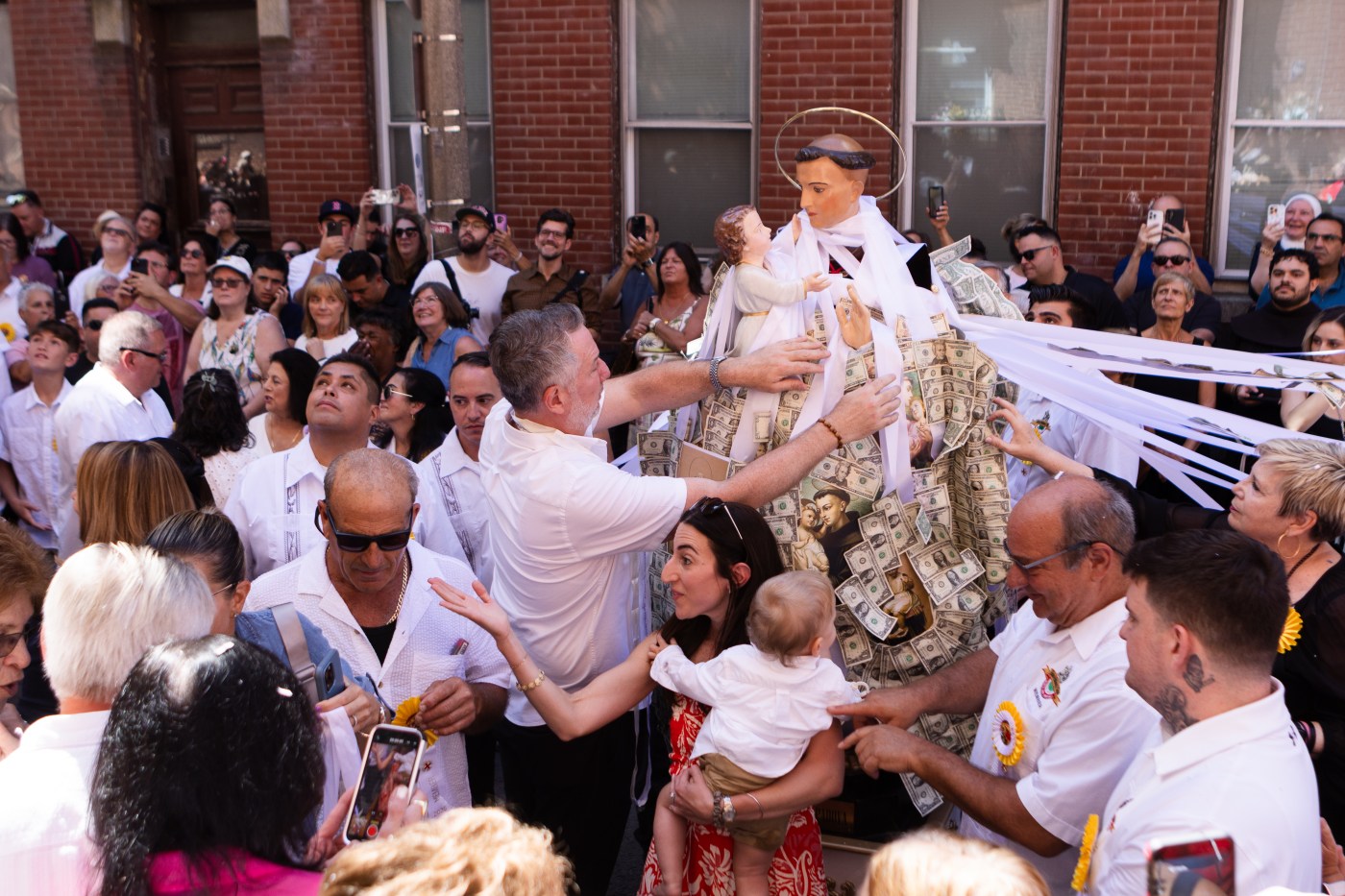 Residents lower money from their windows to be pinned onto the statue of Saint Anthony during the procession at the Saint Anthony’s Feast in the North End. (Libby O’Neill/Boston Herald)