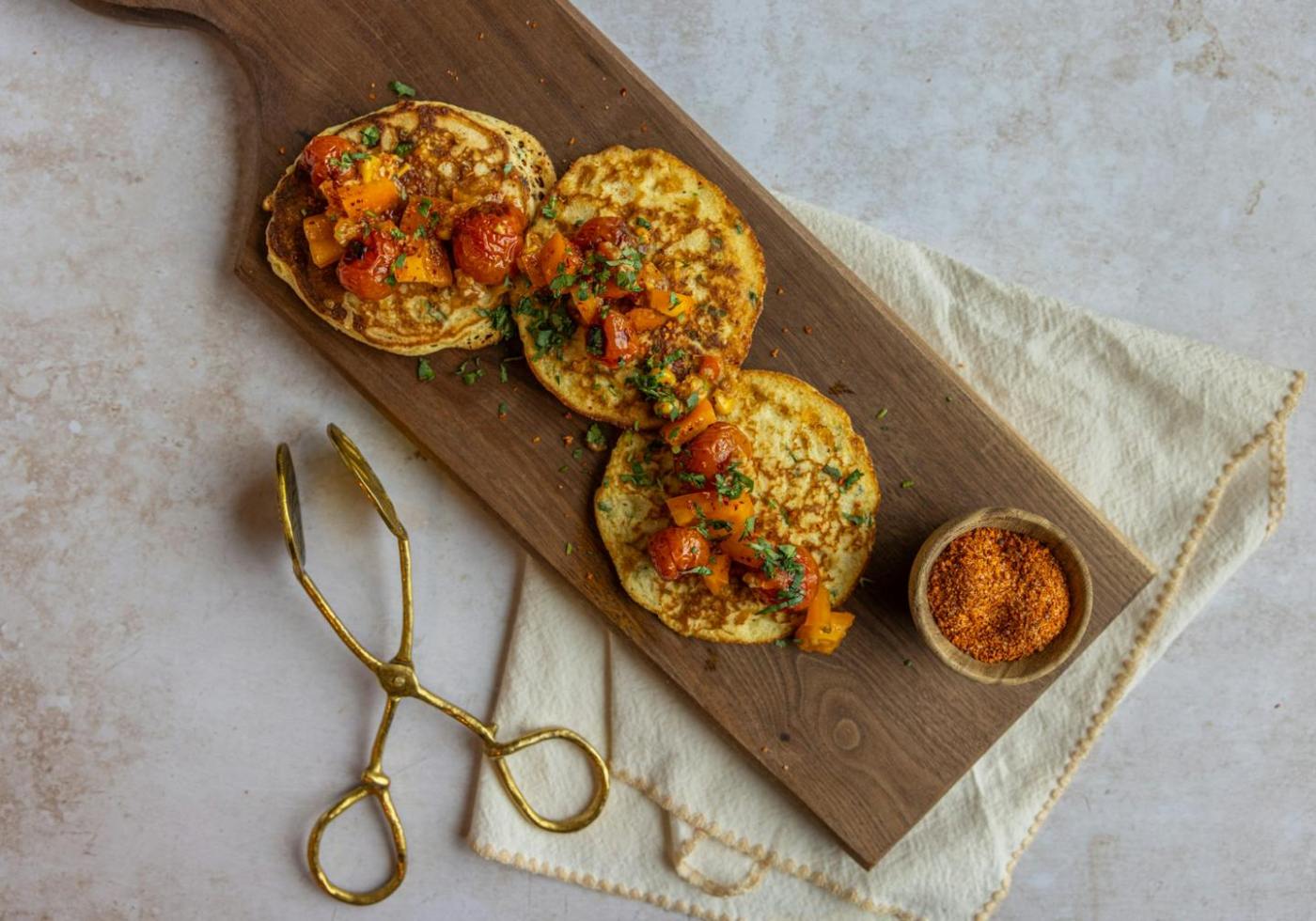 Savory Sweet Corn Pancakes with Jammy Tomatoes and Peppers