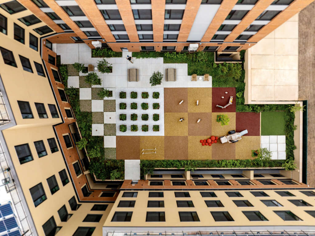 The courtyard at 326 Rockaway Ave. in Brownsville, an all-electric Passive House development by Slate Property Group, RiseBoro Community Partnership, and Goldman Sachs. Photo by Barrett Doherty, courtesy of OSD (Office of Strategy + Design)