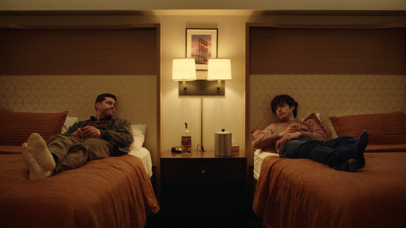 Dylan O’Brien’s Roman, left, and James Sweeney’s Dennis attend a party in “Twinless.” (Courtesy of Roadside Attractions)