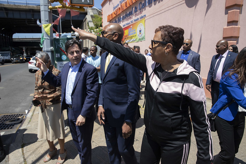 City Planning Director Dan Garodnick, Queens Borough President Donovan Richards and Council Speaker Adrienne Adams during a walking tour of the Jamaica rezoning area in 2023. The Council will hold a hearing on the plan Tuesday. (John McCarten/NYC Council Media Unit)