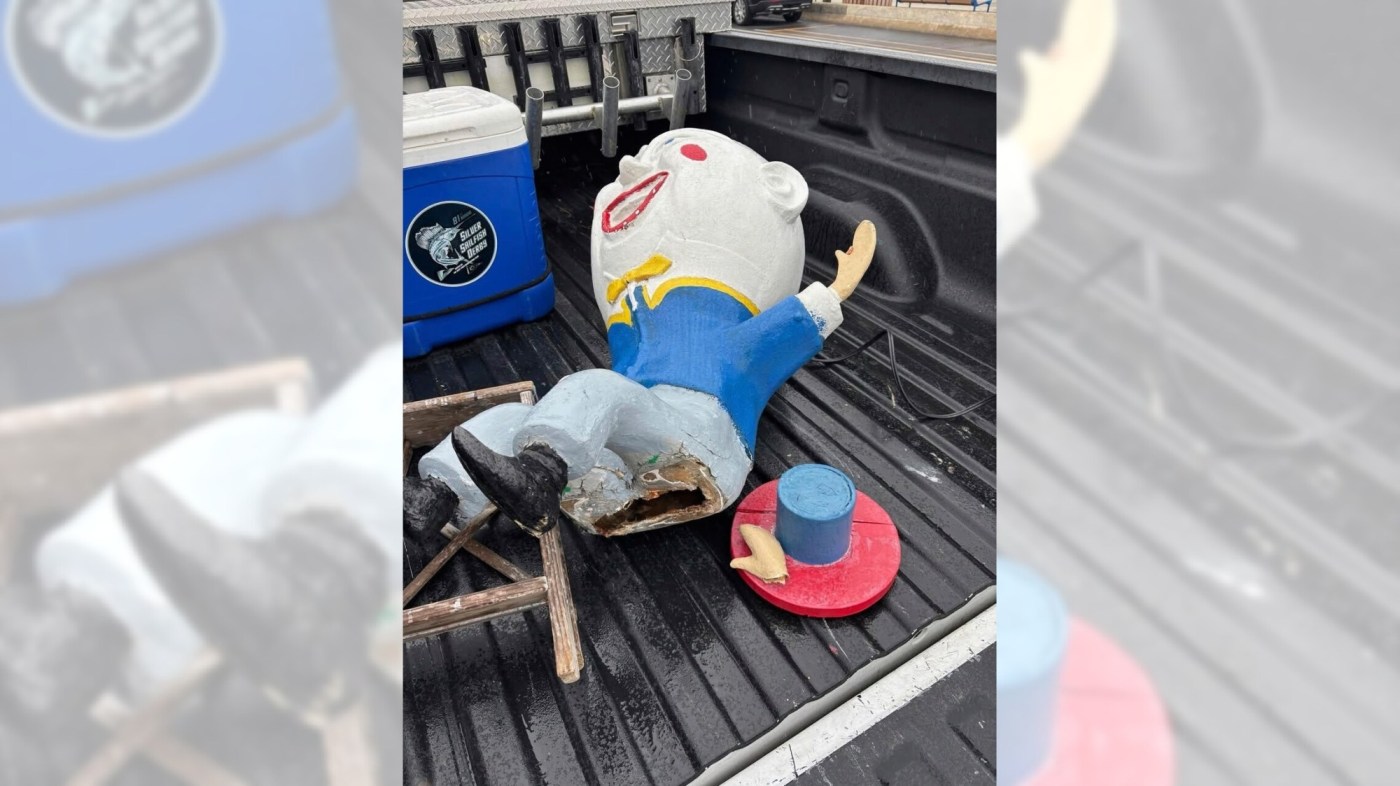 The statue, showing a smiling Humpty Dumpty with big, white head, red cheeks, a yellow bow tie, a blue jacket and gray pants, was found several properties away. In a nursery rhyme, Humpty Dumpty falls off a wall and all the king’s horses and all the king’s men can’t put him back together again.