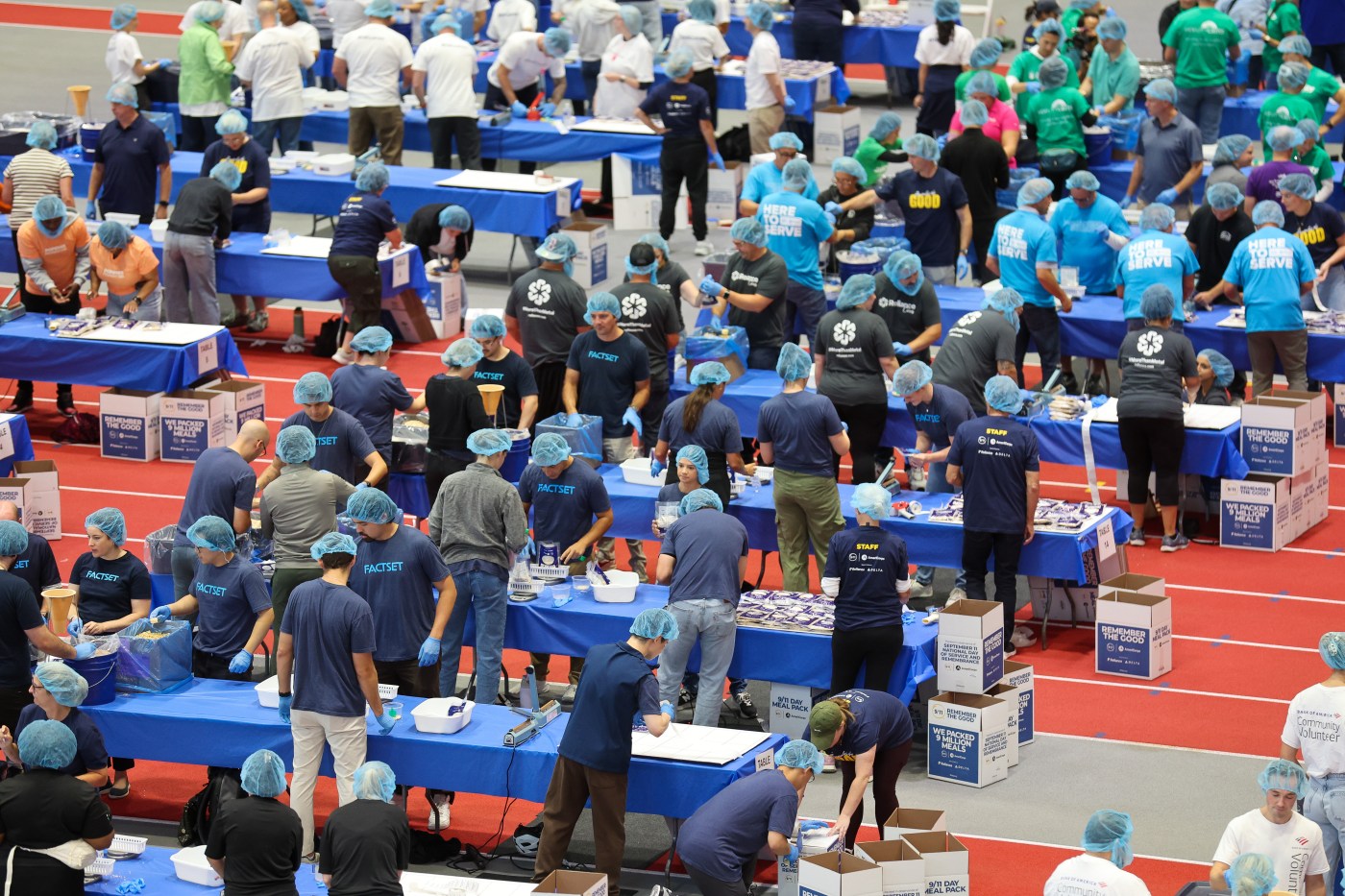Hundreds of volunteers gathered at the TRACK at New Balance to pack meals for the needy during the 9/11 Day National Meal Pack Program.