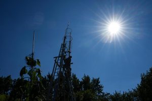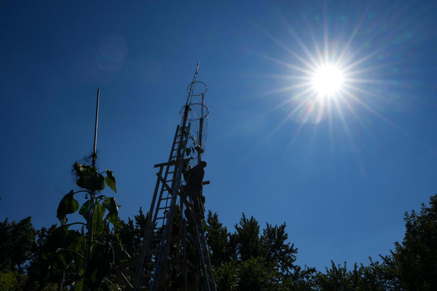 Alex Babich, climbs on the structure that surrounds his nearly 36-feet high sunflower that holds the world record for the tallest flower at his home in Fort Wayne, Ind., Thursday, Sept. 11, 2025. (AP Photo/Michael Conroy)