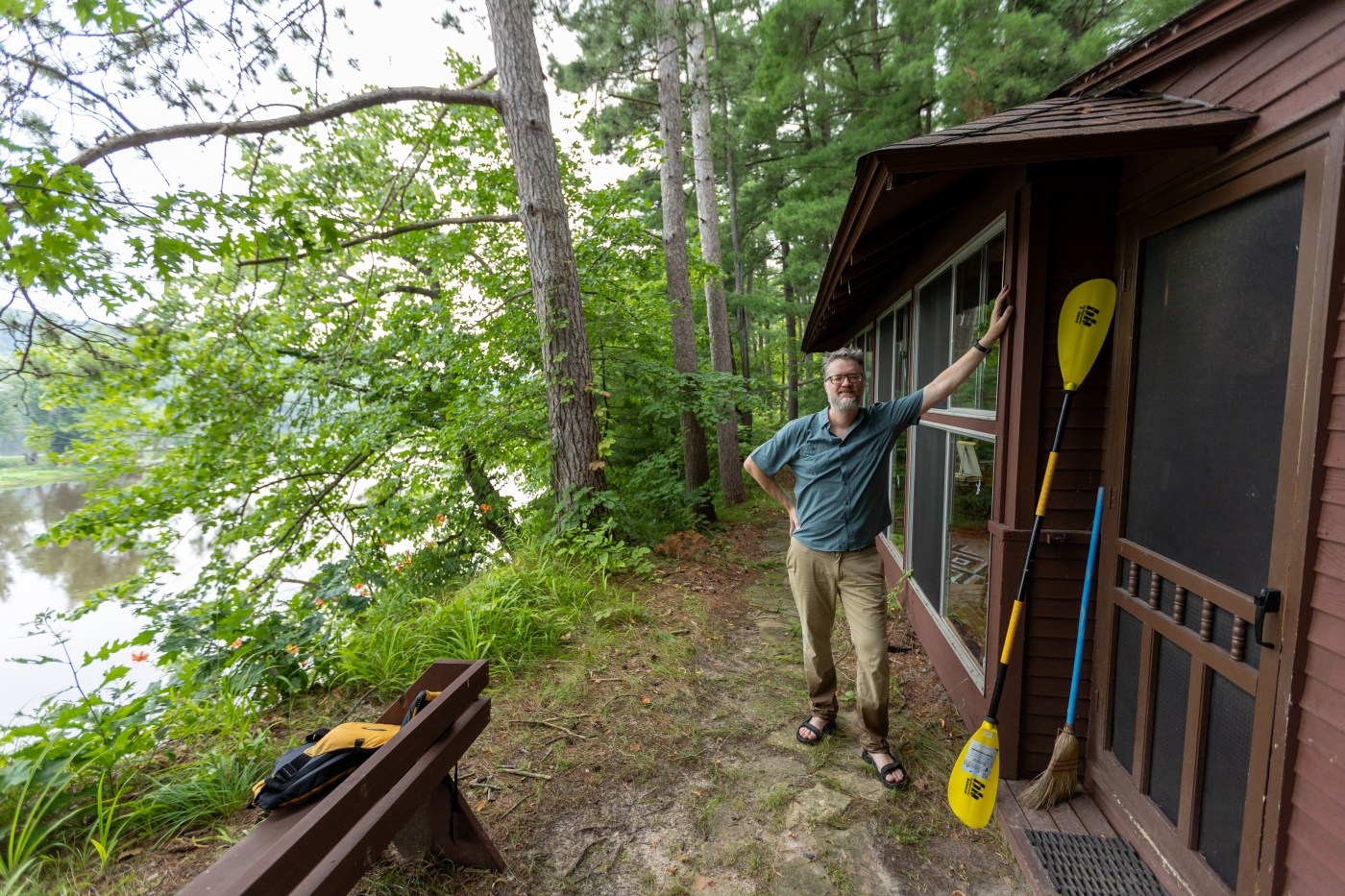 Greg Seitz sits at a desk overlooking the St. Croix River while working on his book at the historic Pine Needles cabin in Marine on St. Croix on Aug. 4, 2025. Seitz hopes to complete the manuscripts in the next two years. (Bennett Moger / Pioneer Press)