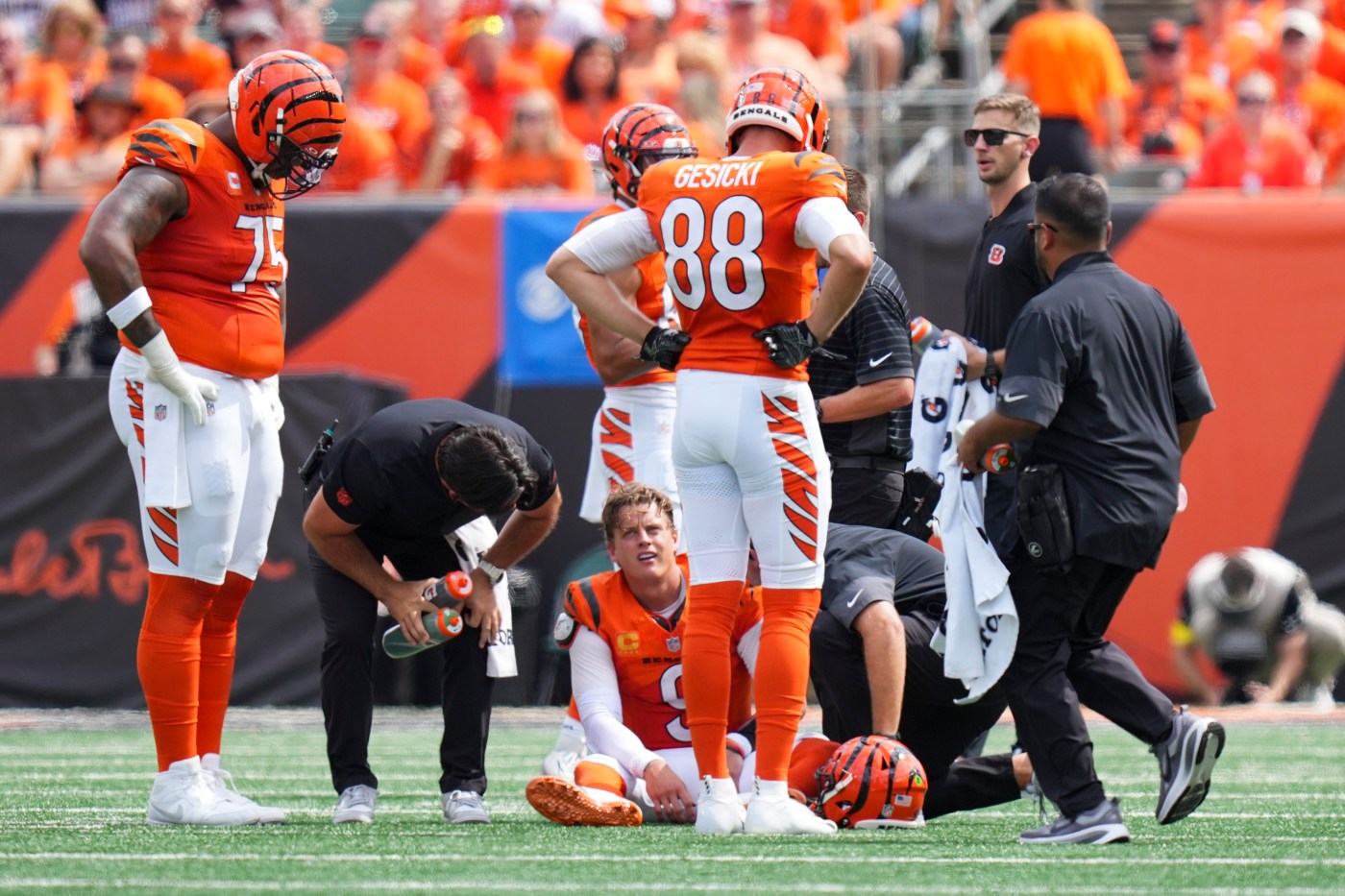 Cincinnati Bengals quarterback Joe Burrow (9) reacts after an injury during an NFL football game against the Jacksonville Jaguars Sunday, Sept. 14, 2025, in Cincinnati. (AP Photo/Jeff Dean)