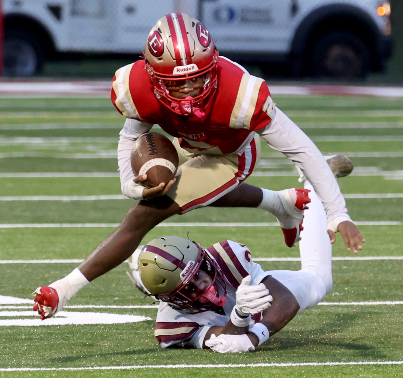 during a football clash in Everett. (Mark Stockwell/Boston Herald)
