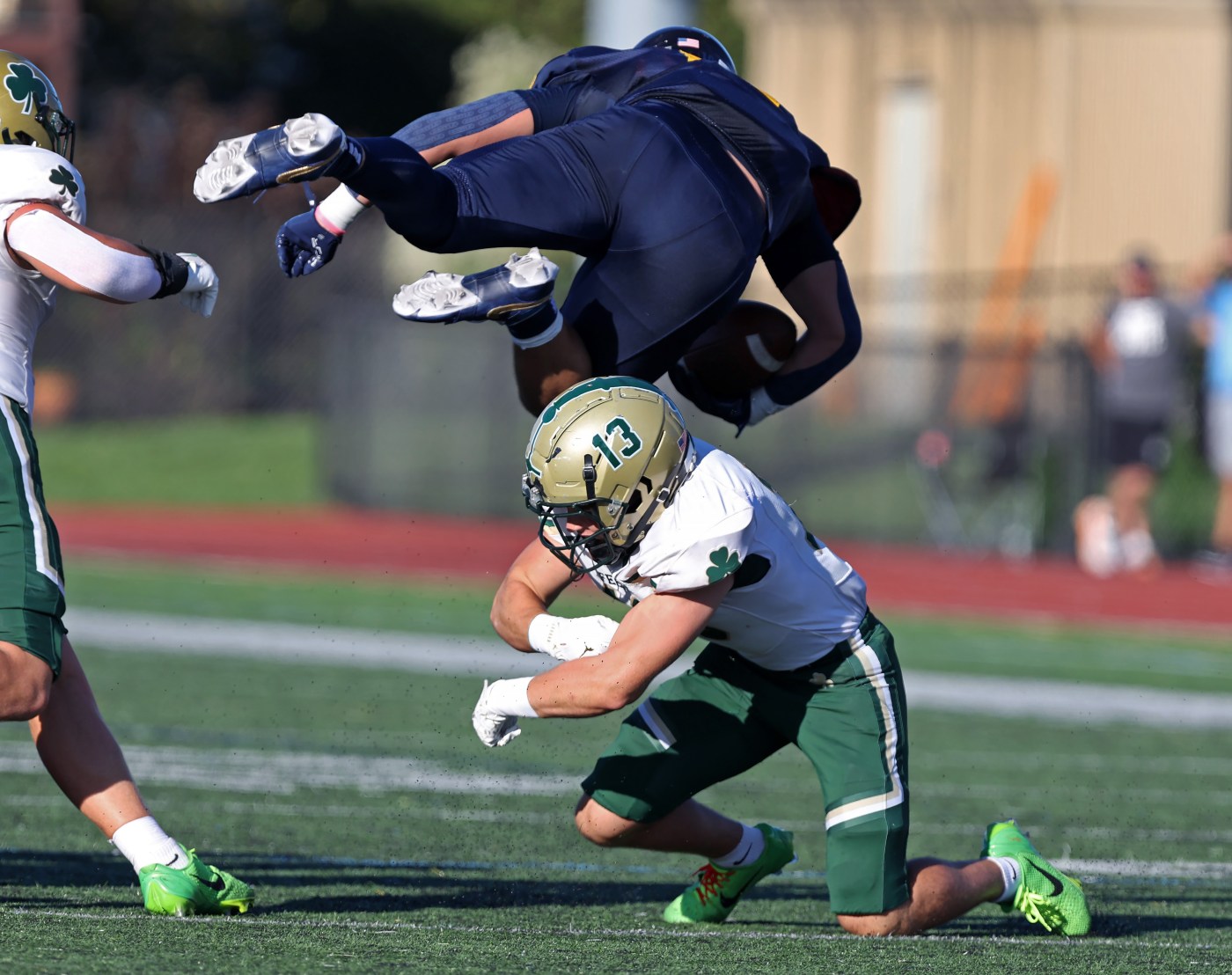 The boost would be short-lived, as the Shamrocks seized the momentum back with a strong defensive response and took possession over at the Spartans’ 29-yard line. Two plays later, senior quarterback Owen Mordas connected on a beautiful bomb to senior receiver Brody Carges for a score to make it 14-7.