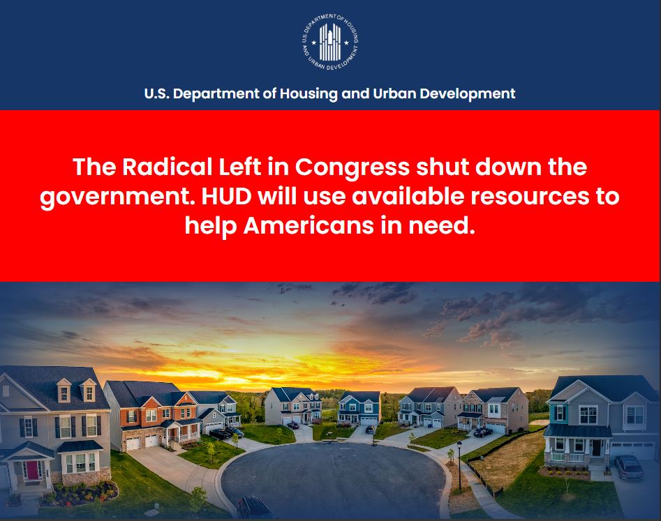 “The Radical Left in Congress shut down the government. HUD will use available resources to help Americans in need,” the U.S. Department of Housing and Urban Development states in a red banner at the top of its homepage at HUD.gov.