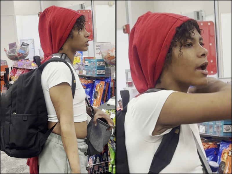 Security images shared by the Boston Police Department depict a woman with curly hair wearing a cropped white T-shirt, light gray sweatpants, a black backpack and a red hooded sweatshirt which she was wearing only by the hood.