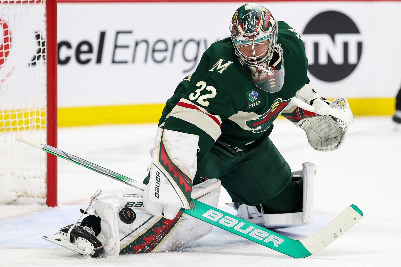 Filip Gustavsson #32 of the Minnesota Wild looks on prior to the start of the game against the Vegas Golden Knights during Game Three of the First Round of the 2025 Stanley Cup Playoffs at Xcel Energy Center on April 24, 2025 in St Paul, Minnesota. The Wild defeated the Golden Knights 5-2. (Photo by David Berding/Getty Images)