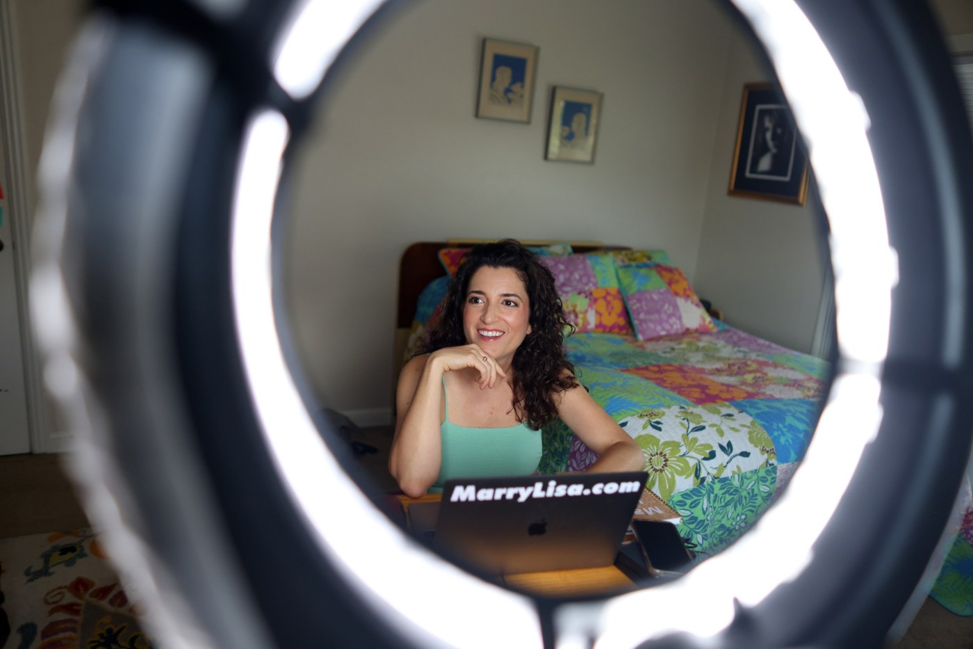 Lisa Catalano in her apartment on Tuesday, Sept. 30, 2025, in San Mateo, Calif. Catalano decided to market herself by buying space on digital billboards to advertise her website https://www.marrylisa.com/. So far she has received over 1,900 marriage applications. (Aric Crabb/Bay Area News Group)