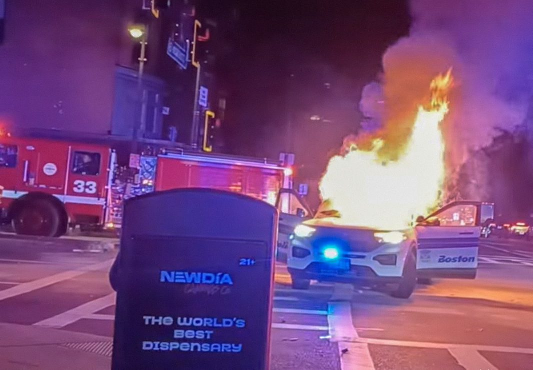 A police cruiser was torched and officers were assaulted early Sunday morning when a street-racing takeover with over 100 participants turned violent at the intersection of Tremont Street and Massachusetts Avenue.