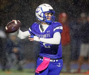 In the second quarter, conditions began to worsen as the skies opened up. With torrential downpours taking over the game, the Hawks sputtered offensively. Hanover’s star quarterback Max Morin found himself in a handful of difficult situations, throwing four interceptions in the first half. DiMeo came up with two picks himself, the second of which he took for a 35-yard touchdown with 3:01 to play in the half.