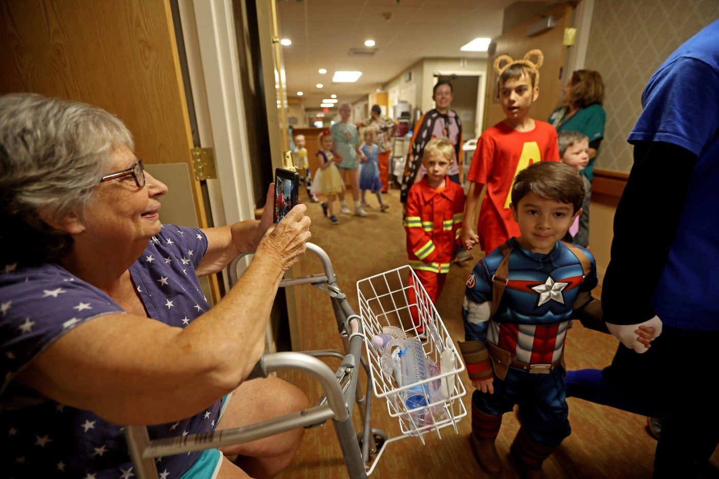 Children from St. Theresa of Avila School parade in their Halloween costumes for the residents of Edelweiss Village Assisted Living. (Stuart Cahill/Boston Herald)