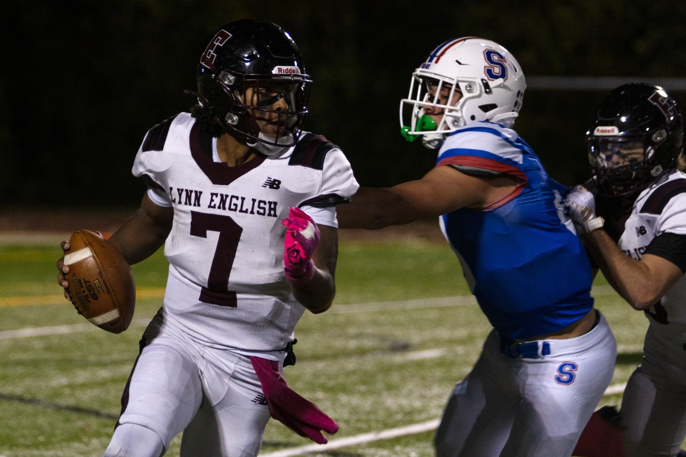 English (6-2, 4-0) joined the GBL in the spring COVID season of 2020, and the program is now at the top of the division. They took an early advantage against Somerville by playing with purpose on their first drive, needing only six plays to punch the ball into the end zone. Xavier Beauchamp rushed three times on the drive for 75 yards, making an early statement with a 36-yard touchdown run – and a two-point conversion – for an early 8-0 lead.