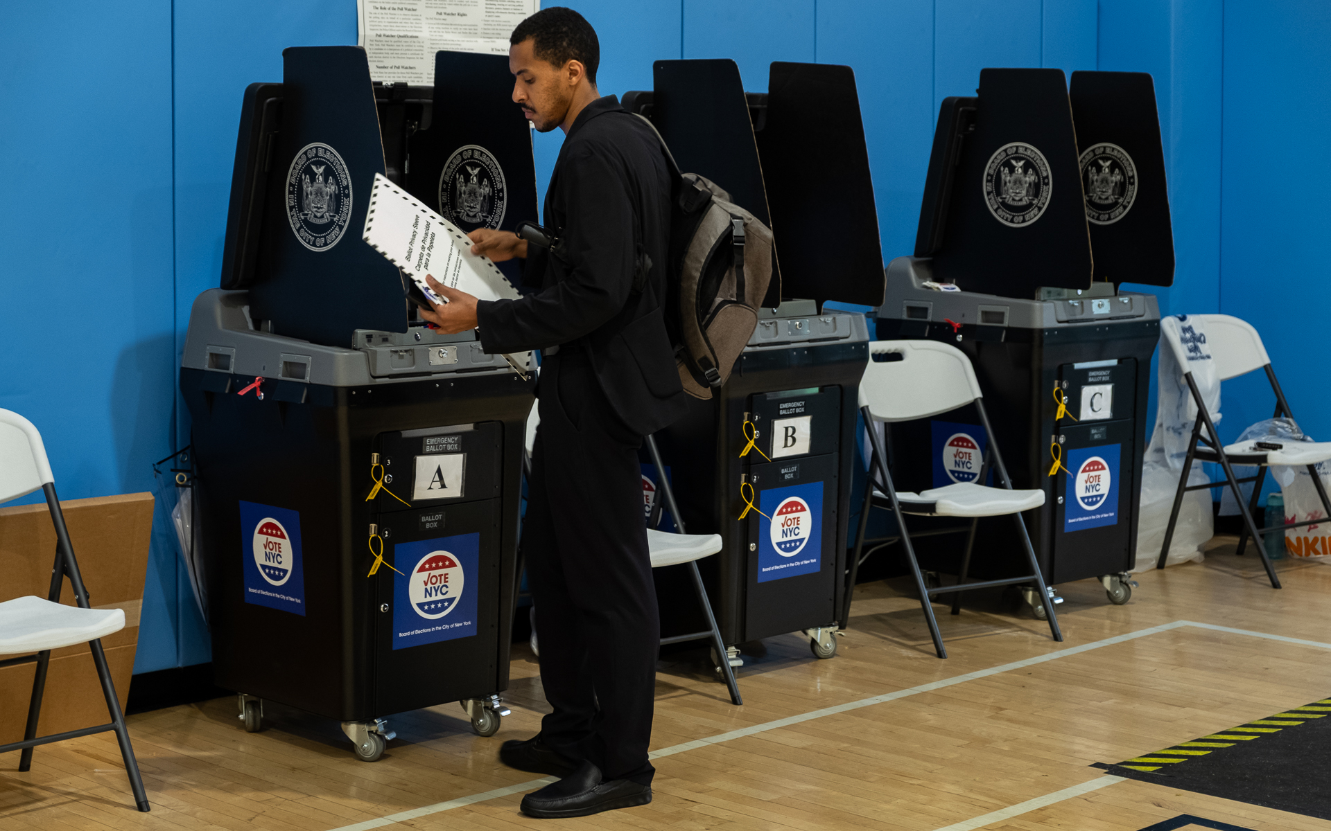 A voter in The Bronx submits his ballot during the June primary. (Adi Talwar/City Limits)