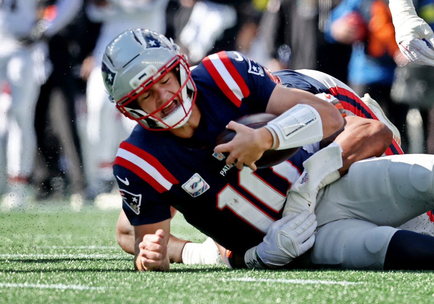 The Patriots’ quarterback has been sacked 34 times this season. That’s the second-highest mark in the NFL behind Titans rookie quarterback Cam Ward.