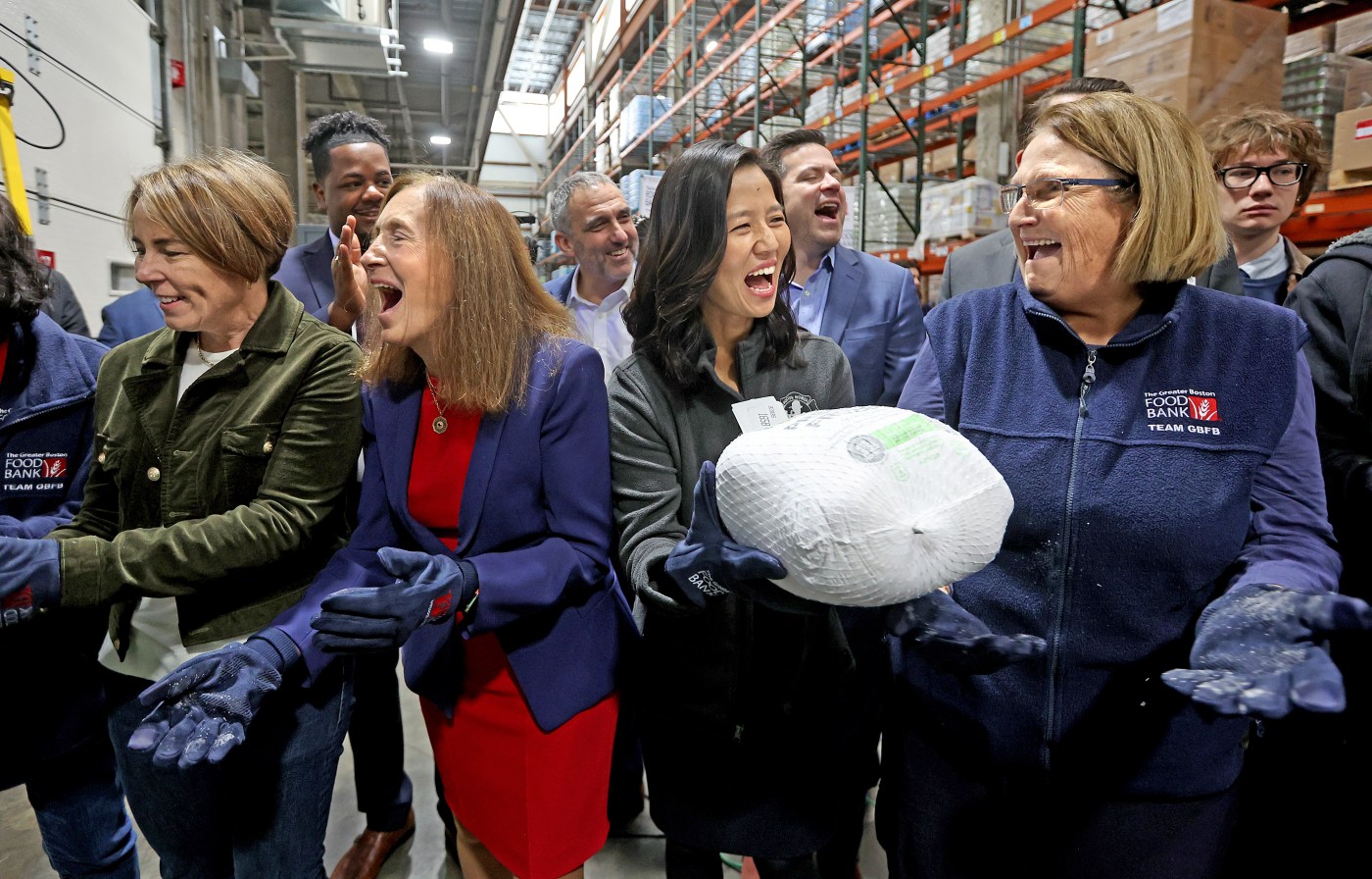 “Twenty years is an incredible milestone, and it takes so much to build an effort that continues throughout that time,” said Mayor Michelle Wu as volunteers gathered in the food bank to offload turkeys into the food bank. “But in some ways, it feels like this year right now, we need it more than ever.”