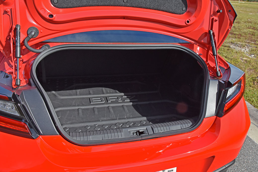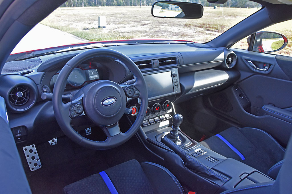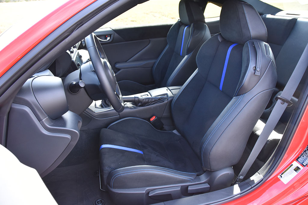 There’s really no getting around the smallish cabin, but after finding a good seating position, you find that the interior is quite accommodating for those who aren’t looking to move around much. The rear seats are a challenge in most cases, but you may fit a child car seat in place through some clever choreography. Subaru does a little extra for the BRZ tS trim with the Ultrasuede seats and the blue accents throughout, but you still get an excessive amount of road noise in any trim level of the BRZ.