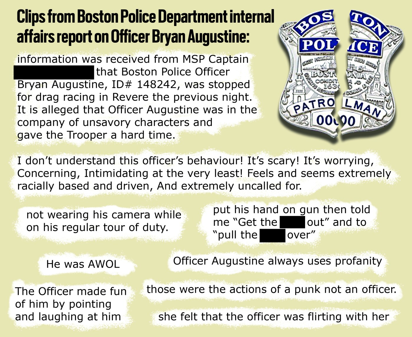 In 2022: “Calling in sick when he had exhausted his sick time and vacation time… failed to report for duty… he was AWOL for the tour… Officer Augustine has continually demonstrated a lack of attentiveness toward his time and attendance as a Boston Police Officer. His current pattern is evidence of complete unawareness or total disregard for his actions, placing his fellow officers and the unit at risk.”